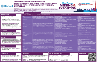 Conclusions: Tec and Tal seem to be well tolerated in RRMM patients with CrCl < 40ml/min without added toxicities. Patients with RRMM with renal insufficiency should not be excluded from getting Bispecifics.