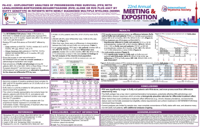 Treatment effect was substantially different according to Duffy status and more pronounced than that observed by race. The Duffy antigen has a key role in cytokine/chemokine homeostasis, potentially affecting MM pathobiology and inflammatory stressor responses, thereby providing a biologically plausible rationale for differential treatment effect. Current analyses are limited by sample size, near-complete concordance of Duffy status with race, and absence of Duffy null White/other race patients, with additional analysis therefore ongoing.