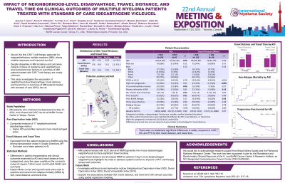 Ide-cel, the first CAR T cell therapy approved for MM, shows notable responses and improved survival. Despite racial, ethnic, and socioeconomic disparities in MM incidence and outcomes, impacts of place of residence and neighborhood-level socioeconomic factors on outcomes of MM patients (pts) treated with CAR T cell therapy are mostly unknown. Here we look at effects of neighborhood-level disadvantage and travel distance (TD)/time on outcomes of MM pts treated with SOC ide-cel.