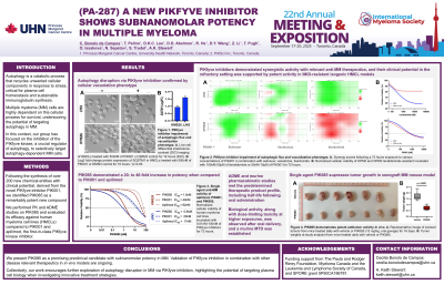 Conclusions: We present PIK085 as a promising preclinical candidate with subnanomolar potency in MM. Validation of PIKfyve inhibition as a single agent and in combination with other disease relevant therapeutics in in vivo models are n ongoing. Collectively, our work encourages further exploration of autophagy disruption in MM via PIKfyve inhibition, highlighting the potential of targeting plasma cell biology when investigating innovative treatment strategies.