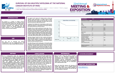 IgA myeloma is a subtype of multiple myeloma, representing approximately 20% of all myeloma cases. It's the second most common type, after IgG myeloma, which accounts for about 52% of cases. IgA myeloma is generally considered more aggressive than IgG myeloma. Survival has improved significantly with modern treatment. In Peru, bortezomib-based triple therapy is used as first-line treatment. Our aim was to describe the clinical characteristics and the progression-free and overall survival of IgA multiple Myeloma patients.