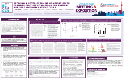 Methods: We developed our culture cocktail platform in a systematic, data-driven manner cross-referenced with literature to allow the discovery of novel cytokines. Bioinformatic analyses utilized the MMRF-CoMMpass RNA-Seq dataset of 770 MM patients to investigate cytokine and receptor mRNA expression associated with defined MM patient characteristics and clinical outcomes. Based on the 13 resulting cytokines, a high-throughput combinatorial screen of 2- and 3-cytokine combinations was performed on CD138+ MM patient samples (n=3) over 96 hours. The 10 most viable doublet or triplet cytokine combinations were further validated on more primary CD138+ and whole bone marrow MM patient samples (n=4) as well as plasma cell leukemia (PCL) patient samples (n=3) that were previously engrafted in NRG-3GS mice. Readouts by flow cytometry.