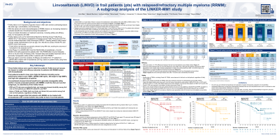 Bispecific antibodies (bsAbs) are a significant advancement for certain pts with MM. Frailty is known to be a key indicator of pt prognosis and impacts the efficacy and toxicities of MM therapy. Currently, data are limited on how frailty impacts outcomes for pts treated with bsAbs. In LINKER-MM1 (NCT03761108) LINVO, a human BCMA×CD3 bsAb approved in the EU, showed high response rates with a generally manageable safety profile in pts with RRMM. We report efficacy and safety from LINKER-MM1 based on frailty status.