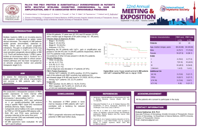 Results: Of the 54 patients, 31 were men (57.4%) and 23 women (42.6%) with a median age at diagnosis of 64 years (range, 42 - 86 years). Disease stage at diagnosis defined by R-ISS was I in 10 (18.5%) patients, II in 23 (42.6%) patients, III in 19 (35.2%) patients, while for 2 (3.7%) patients it was unknown. Regarding the 45 patients with 1q21+, gain or amplification was present in 29 (64.4%) and 13 (28,9%) patients respectively, while for 3 (6.7%) patients it was unknown. Co-existence of other CA was present in 28 (62.2%) patients. Detection of TP53 was found in 10 (22.2%) patients while t(4;14), t(14;16) and t(11;14) were found in 8 (17.7%), 5 (11.1%) and 5 (11.1%) patients respectively. Lactate dehydrogenase (LDH) at diagnosis was elevated in 17 patients (37.8%). PBX1 protein was expressed in 22 (49%) patients with 1q21+, whereas 23 (51%) were negative. Half of the patients with PBX1 positivity had additional CA and disease stage III R-ISS was found in 10 (10/22, 45.5%) of them. Of the 9 patients lacking 1q21+, PBX1 protein was expressed in 2 (2/9, 22.2%) patients. The estimated 5-year OS for the patients who expressed PBX1 was 34.4% (95% CI: 16.2%-72.8%) versus 48.7% (95% CI: 25.8%-91.9%) for PBX1 negative patients (p 0.54).