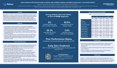 Renal failure is common in patients with newly diagnosed multiple myeloma (NDMM) and is associated with unfavorable outcomes. Daratumumab (Dara) is associated with rapid light chain reduction and may improve patient outcomes. We hypothesized that, among patients with kidney impairment who started treatment within 15 days of NDMM diagnosis, early Dara initiation would be associated with improved outcomes.