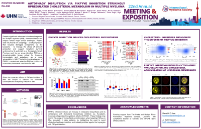 Unbiased transcriptomics and proteomics revealed widespread changes in response to PIKfyve inhibition, with lysosomes and autophagy ranked among the top enriched gene sets in PIK001-treated samples, as expected. Notably, cholesterol biosynthesis was the most significantly enriched gene set in PIK001-treated HMCLs and ex vivo samples. Analysis of upregulated proteins across all cell lines revealed robust induction of key enzymes involved in the mevalonate and cholesterol biosynthesis pathways, including HMGCS1, FDFT1, and IDI1. In line with these findings, a 1.5 to 2-fold increase in total cholesterol levels following PIK001 treatment was confirmed. Synergy studies between PIK001 and cholesterol pathway inhibitors, such as fluvastatin, lycorine, and U18666A, showed strong antagonism, highlighting the importance of cholesterol in mediating the effects of PIK001. Furthermore, preliminary data showed that PIKfyve inhibition induces significant colocalization between LAMP1-positive lysosomes and the cholesterol stain filipin, indicating an accumulation of cholesterol in lysosomal membranes.