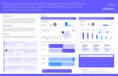 With improving survival rates in Multiple Myeloma (MM), patients face complex treatment regimens and symptom burdens. Real-world data remains fragmented, and while primary care (PC) records offer insight into treatment exposure and care trajectories, they lack resolution on daily symptoms and quality of life (QoL). This work combined PC data with that from ‘MyMM’, a patient-designed tool capturing real-time patient-reported outcomes (PROs) and wearable metrics, to better understand MM burden and unmet needs.