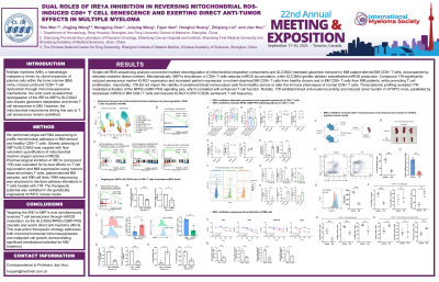We performed single-cell RNA sequencing to profile mitochondrial pathways in MM-derived and healthy CD8+ T cells. Genetic silencing of XBP1s/SLC38A2 was coupled with flow cytometric quantification of mitochondrial reactive oxygen species (mtROS). Pharmacological inhibition of IRE1α (compound 17#) was evaluated for its dual effects on T cell rejuvenation and MM suppression using nutrient-deprived primary T cells, patient-derived BM samples, and MM cell lines. RNA sequencing was employed to disclose pathway alterations in T cells treated with 17#. The therapeutic potential was validated in the genetically engineered Vk*MYC mouse model.