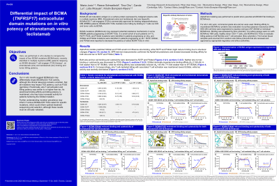 Methods: AlphaFold modeling was performed to predict elra’s parental anti-BCMA Fab binding to BCMAmuts. For all in vitro work, commercial grade elra and tec were used. Binding affinity to recombinant BCMAmut proteins was evaluated via surface plasmon resonance (SPR). HEK-293 cell lines were engineered to express wild type (WT) BCMA or individual BCMAmuts. Binding was assessed by flow cytometry. Co-culture assays were run with BCMAmut HEK cells, healthy donor CD3+ T cells, and BCMAxCD3 TCEs to evaluate killing potency (CellTiterGlo) and T cell activation (flow cytometry).