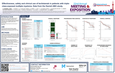 In this ongoing, retrospective, multicenter study, myeloma specialists from all Danish healthcare regions reviewed patient charts of all TCE RRMM patients treated with SOC teclistamab during its first year of availability. Data collected included baseline demographics, prior lines of therapy (pLOT), response rates, progression-free survival (PFS), duration of response (DOR), overall survival (OS), adverse events (AEs), and clinical use patterns. The study was conducted in collaboration with Johnson & Johnson and GSK provided financial support.