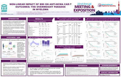 Our findings of a U-shaped BMI-survival relationship in MM patients treated with CAR-T challenges conventional linear analyses, suggesting that metabolic dysregulation may differentially impact CAR-T efficacy at different BMIs. We found a robust effect of BMI on CAR-T outcomes, with overweight BMI patients having worse outcomes than those with normal or obese BMIs. Given that obesity and metabolic disorders affect >40% of the global population and overweight/obesity rates continue to rise, understanding modifiable risk factors that can refine patient selection, or affect toxicity mitigation, and supportive care strategies for CAR-T recipients is critical.