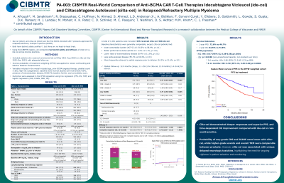 Idecabtagene vicleucel (ide-cel) and ciltacabtagene autoleucel (cilta-cel) are BCMA CAR-T products approved for relapsed/refractory multiple myeloma in 2021 and 2022, respectively, with distinct safety profiles. In the absence of head-to-head trials, we used CIBMTR data to compare their safety and efficacy in a real-world setting.