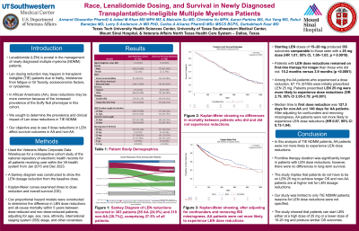 Lenalidomide (LEN) is central to the management of newly diagnosed multiple myeloma (NDMM). However, LEN dosage reductions may occur, especially in transplantation-ineligible patients who are less fit. These reductions may occur differently in African American (AA) patients due to socioeconomic disparities or baseline neutropenia due to the Duffy-null phenotype. We sought to determine the prevalence and clinical impact of LEN dose reductions in AA patients using a large United States Veterans Affairs (VA) database.