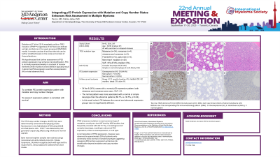 Deletion of (17p) in ≥20 % neoplastic cells or TP53 mutation (TP53mut) regardless of VAF level are defined as high-risk factors in the newly proposed IMS/IMWG model. It remains unclear if the risk can be further stratified based on the scale and context of these alterations. We hypothesized that further assessment of p53 protein expression may allow an integrated risk assessment. In wild type TP53, p53 expression by immunostaining is weak and heterogenous while mutations or deletions typically result in abnormal p53 expression as overexpression (HI) or total absence (Null).
