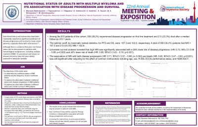 Nutritional status and malnutrition have been repeatedly reported as significant predictors of disease progression and survival in many cancer patients, especially those with solid tumors. Although there is evidence that poor nutritional status can be also present in patients with hematological malignancies, including multiple myeloma (MM), its prevalence and impact on disease outcomes have not been widely explored in adequate samples.