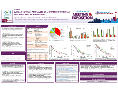 This retrospective chart review included patients diagnosed with MM between 2000-2023 treated at our regional cancer center, serving a population over 500,000, both urban and rural. Pts with solitary plasmacytoma or amyloid, who has not progressed to symptomatic myeloma, and those who received < 1 cycle of therapy were excluded. Treatment was provided via standard provincial public funding programs. Causes of death were assessed by electronic medical records. If a pt had progressive myeloma at the time of death, the cause of death was considered related to myeloma, irrespective of reported cause. OS was calculated by Kaplan-Meier curves from time of anti-myeloma therapy initiation until the last assessment (cut off May 05, 2025) or death.