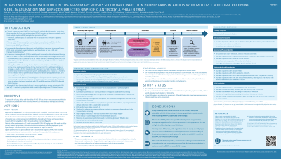 This multicenter, randomized, controlled, open-label phase 3 study is planned to be conducted in North America, South America, Europe and Asia Pacific. Eligible pts must be aged ≥18 years with a documented diagnosis of MM, have recently commenced teclistamab (within 8 weeks), have not received immunoglobulin treatment within 16 weeks before screening and have given informed consent. Exclusion criteria include an Eastern Cooperative Oncology Group performance status score of >2, documented polyclonal immunoglobulin G < 150 mg/dL at the most recent assessment within 4 weeks before starting teclistamab, current serious infection or >1 serious infection within 3 months before screening. Pts who have demonstrated at least a minimal response to teclistamab (assessed during the 8-week screening period based on International Myeloma Working Group criteria) will be randomized 2:1 to receive IVIG 10% 400 mg/kg every 3–4 weeks as either primary infection (from randomization) or secondary infection (after experiencing ≥1 serious infection) prophylaxis and observed for up to 52 weeks.