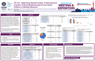 Results: 127 patients were included in our final analysis. Median age was 67 years and 50.8% were female. 58 (45.6%) developed SREs during the study period, and the majority of these patients (45 patient, 36.2%) only had one SRE event. 44 patients (32.8%) had SRE at baseline (within 60 days of diagnosis). 99 patients (77.9%) were prescribed BMA after diagnosis of MM (73.4% zolendronate and 18.2% denosumab). Among these, 53 patients (53.6%) received BMA within 3 months. 38 (29.9%) had delays in BMA initiation, most commonly due to delayed dental clearance (14, 34.1%), physician decision (5, 12.2%), and patient refusal in (5, 12.2%). A total of 12 patients switched BMA type, with suboptimal eGFR (5 patients, 41.7%) being the top reason. 51 patients (48.1%) received dental screening before BMA initiation. 22 (16.4%) patients developed SREs after BMA treatment, with most events (8 cases, 36%) between 2 and 5 years after the first dose of BMA. 24 (17.9%) patients suffered relapse, among which 18 (75%) received BMA. Number of SREs followed a similar distribution for BMA duration ≥ 5 years versus < 5 years. Overall, 67 (52.7%) patients had BMA prescriptions that deviated from the IMWG guideline, most commonly due to delayed (25 patients, 45.4%) or omitted (22 patients, 40%) administration.